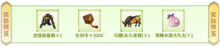 邀春使建队奖励:龙隐装备箱*1、仗剑令*3000、乌犍(永久坐骑)*1、莺舞长歌大礼包*1;